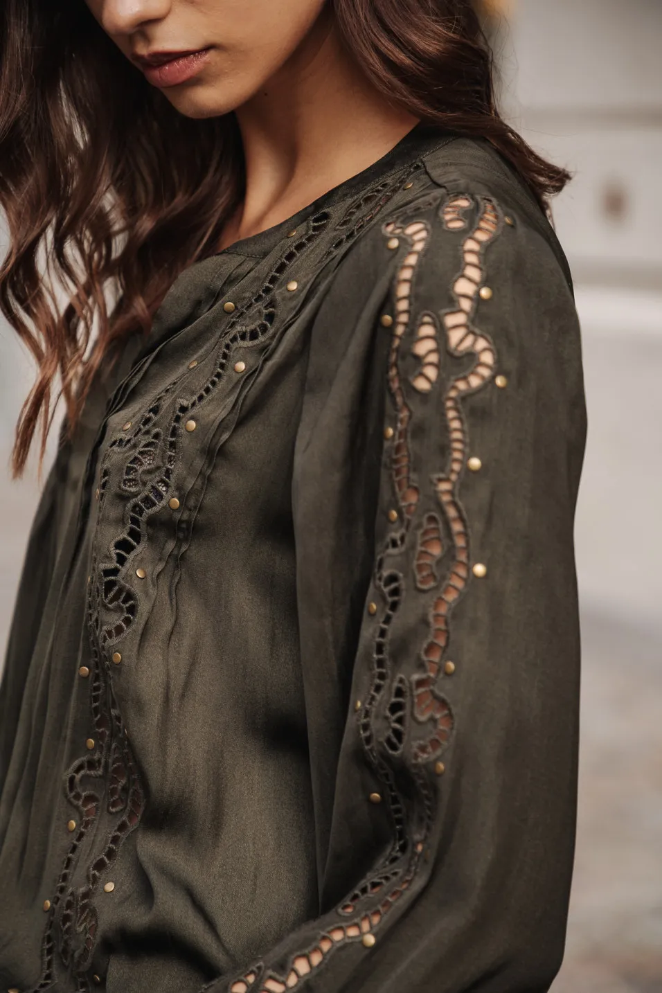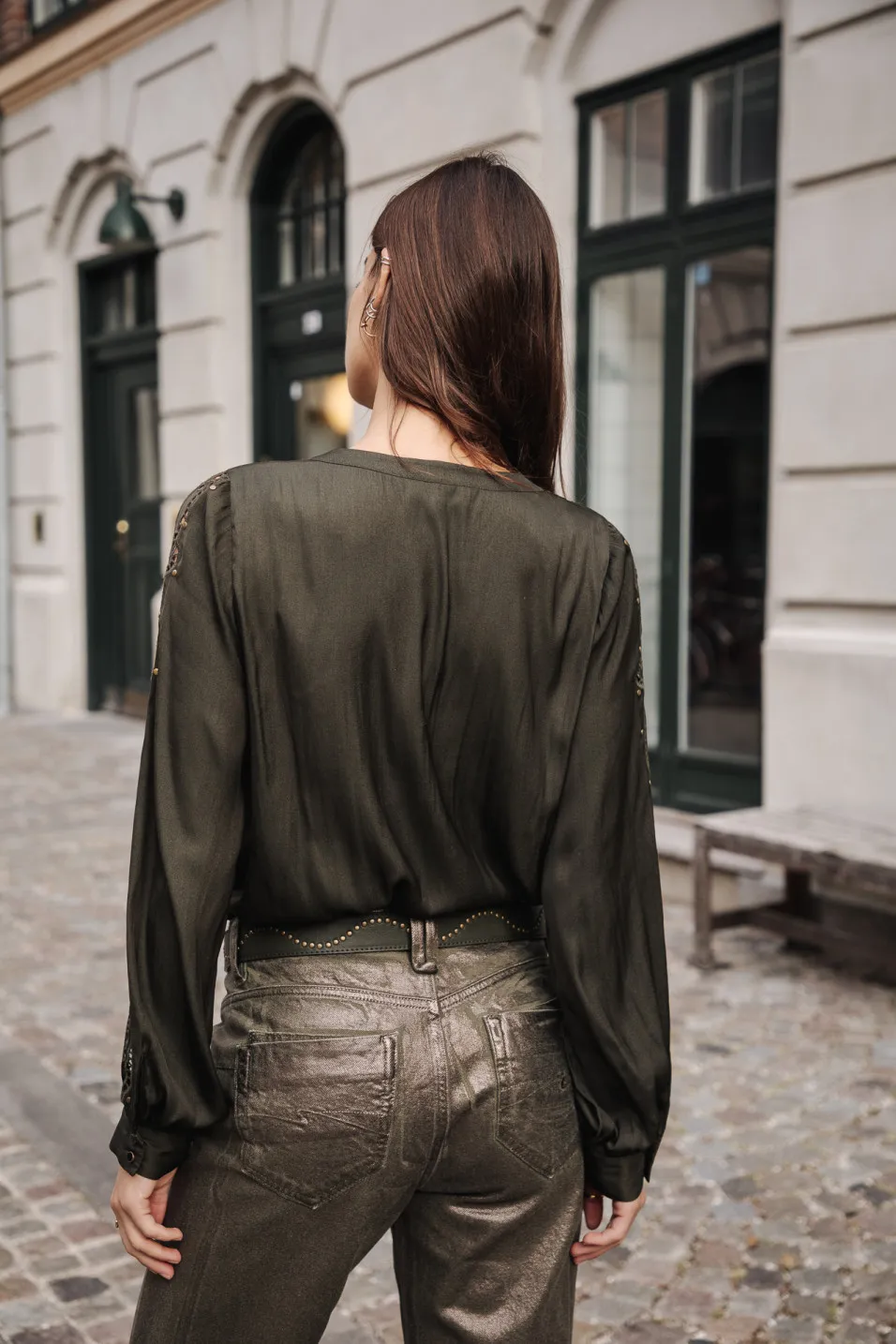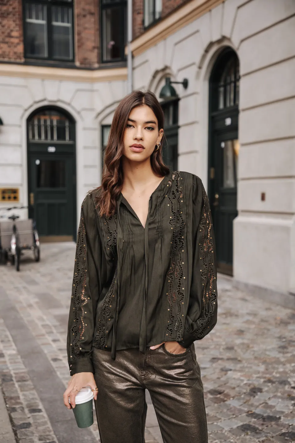 Plain blouse in soft, flowing satin polyester, Loose, long sleeves, V-neckline topped with collar and lavaliere stripes