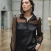 Plain two-ply shirt with tulle upper body, Balloon sleeves in tulle, Back opening with button and drop
