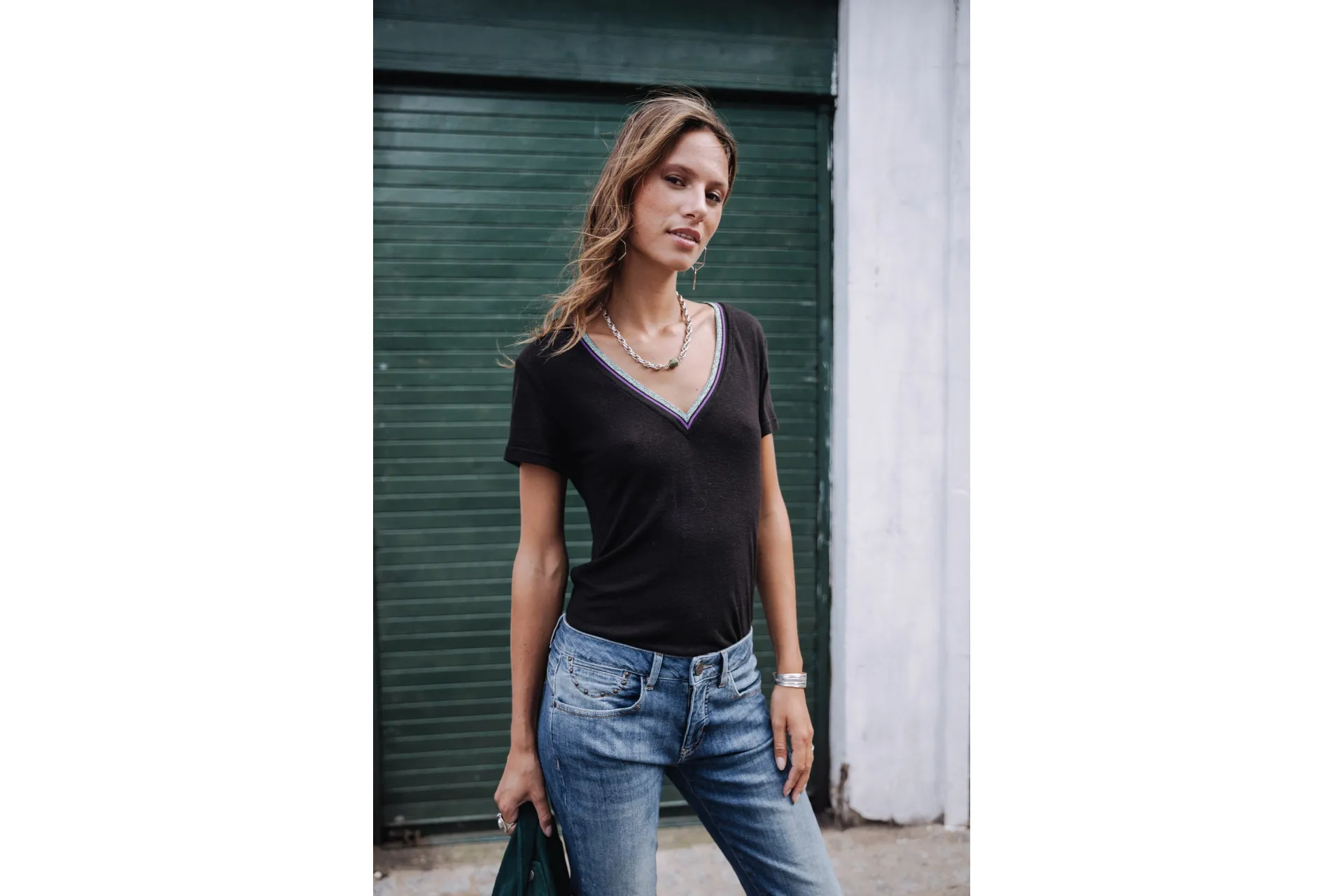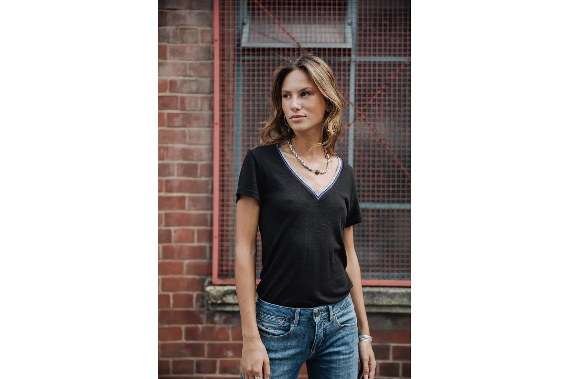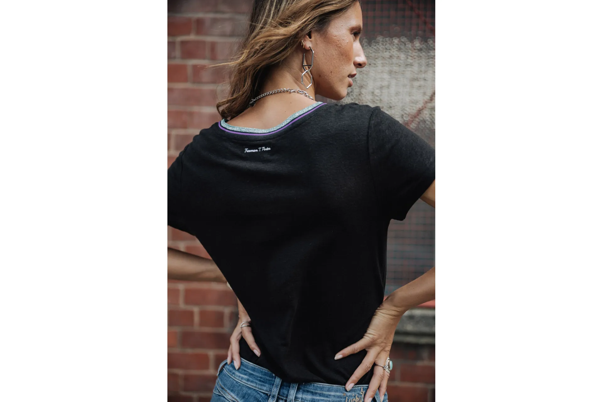 Fancy metallic stitching details along the collar and garment bottom