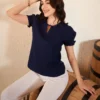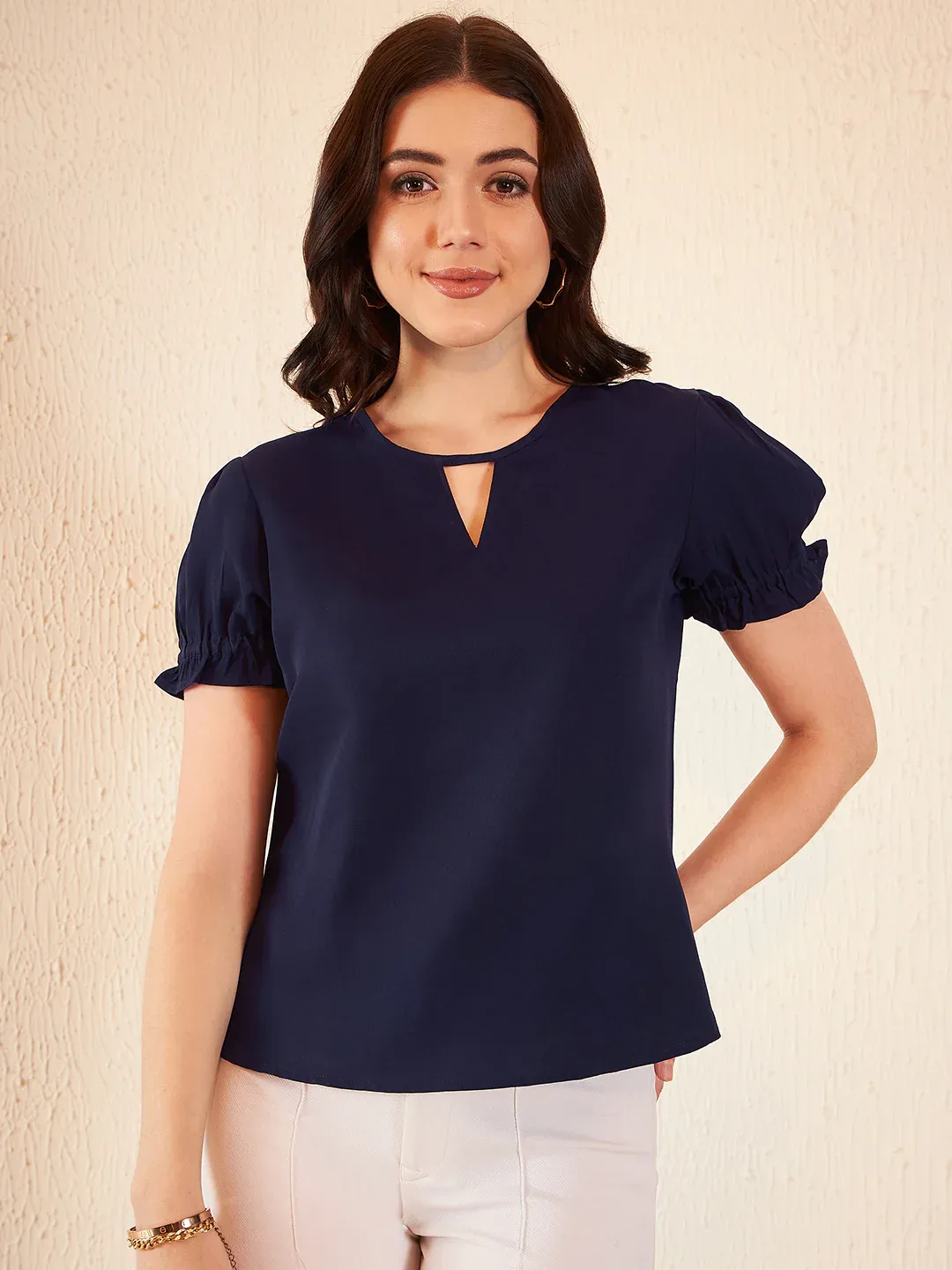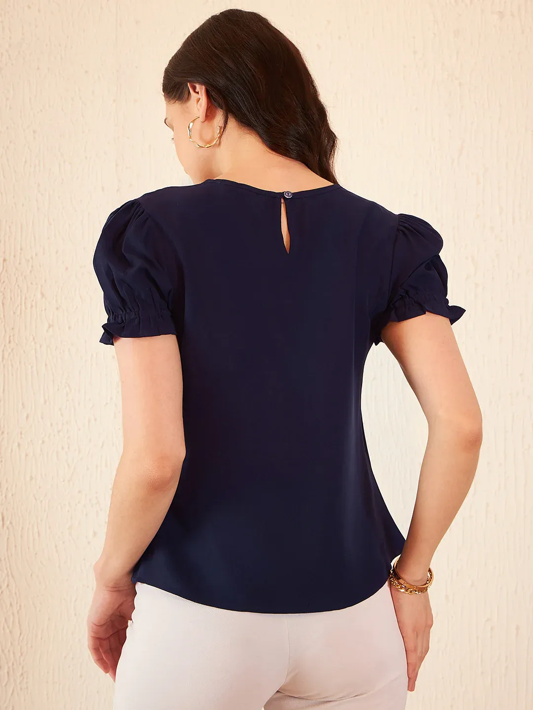Turn heads with this keyhole neck puffed sleeves crepe top. Designed with a chic keyhole neckline and stylish puffed sleeves, it adds a sophisticated touch to your outfit. Made from lightweight crepe fabric, it ensures comfort and elegance. Perfect for casual outings or special occasions, pair it with jeans or skirts effortlessly.