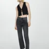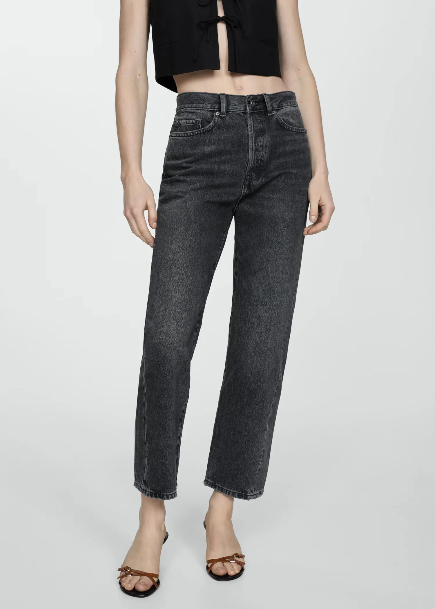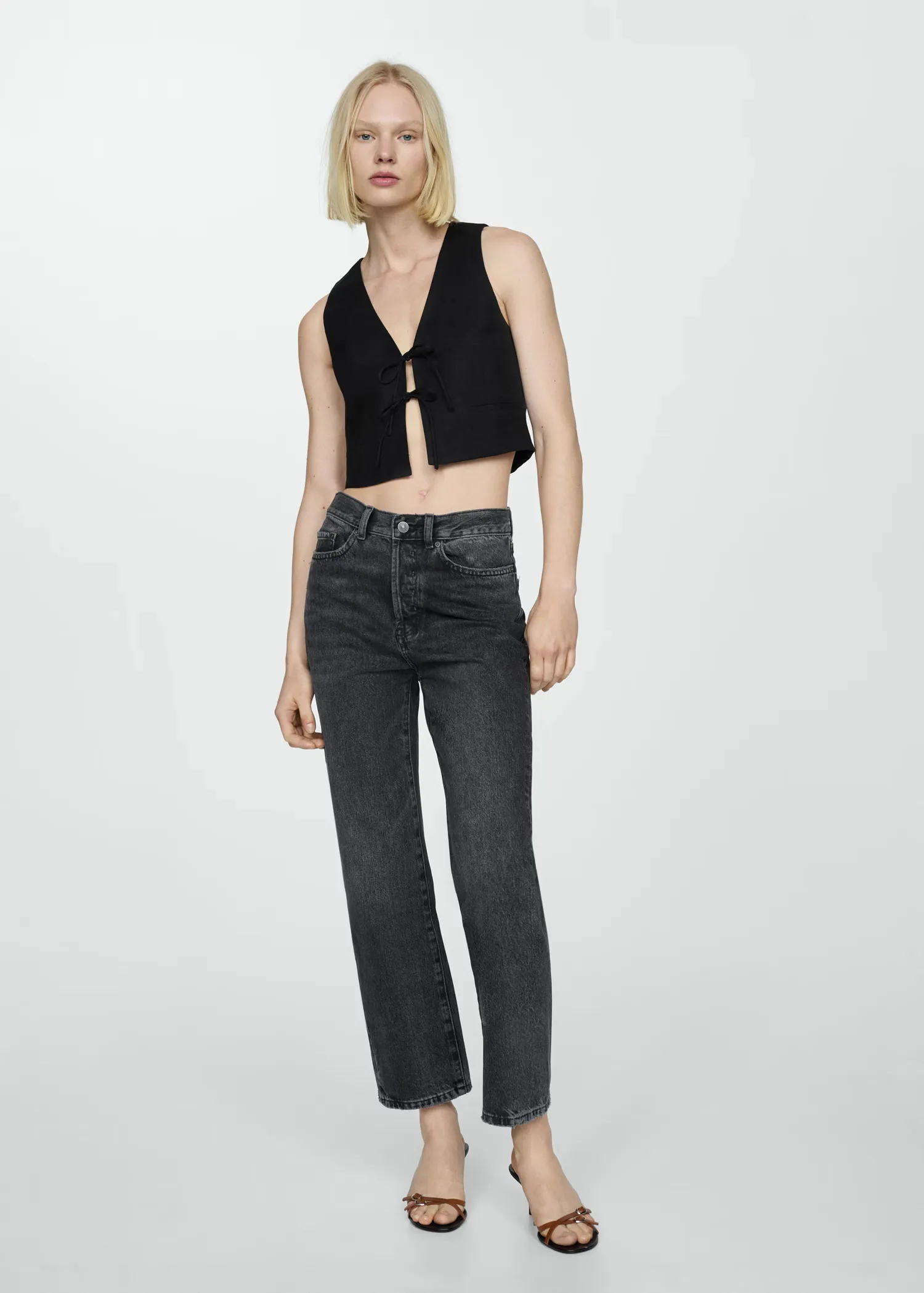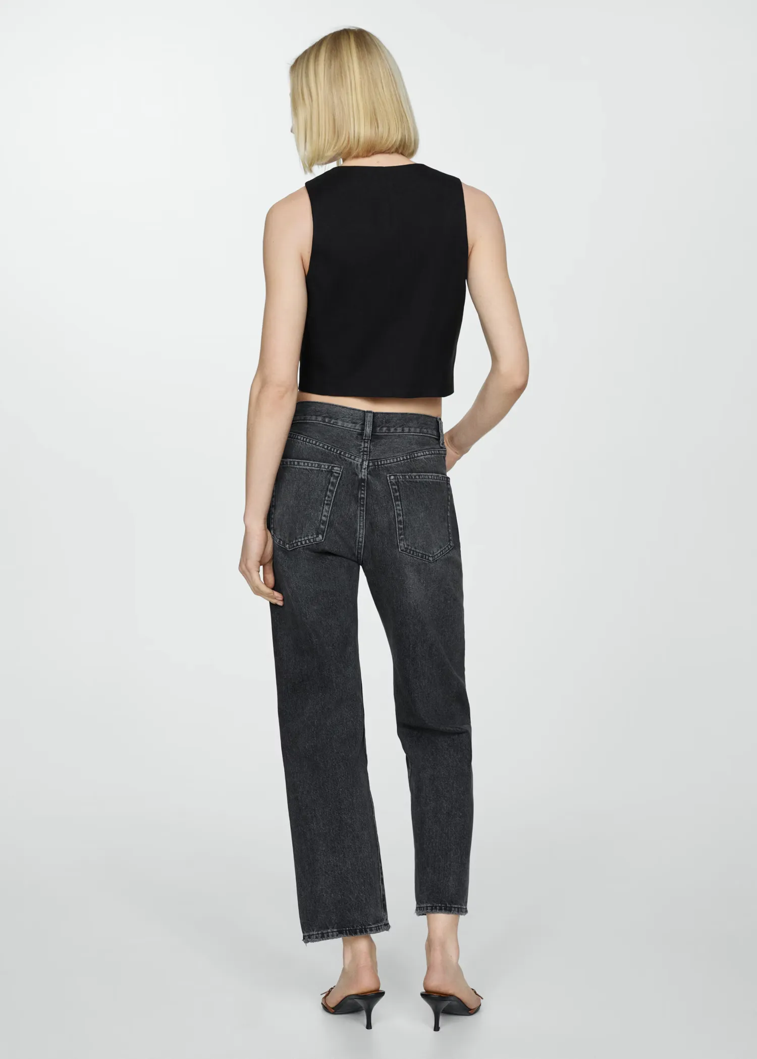 Denim style cotton fabric. Straight design. Cropped design. High waist. Loops. Five pockets. Button up. Front seams. Interior length 72.5 cm. Festival Season.