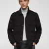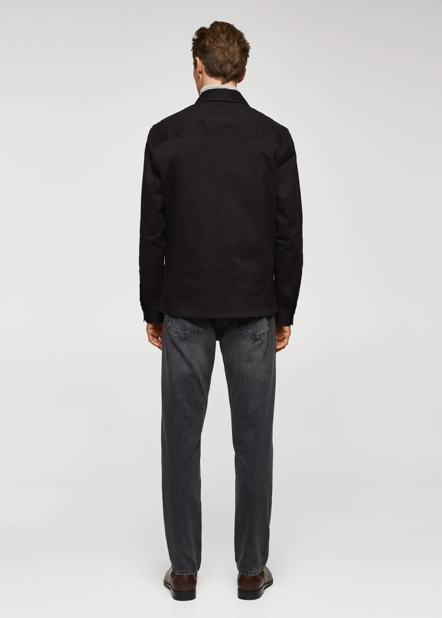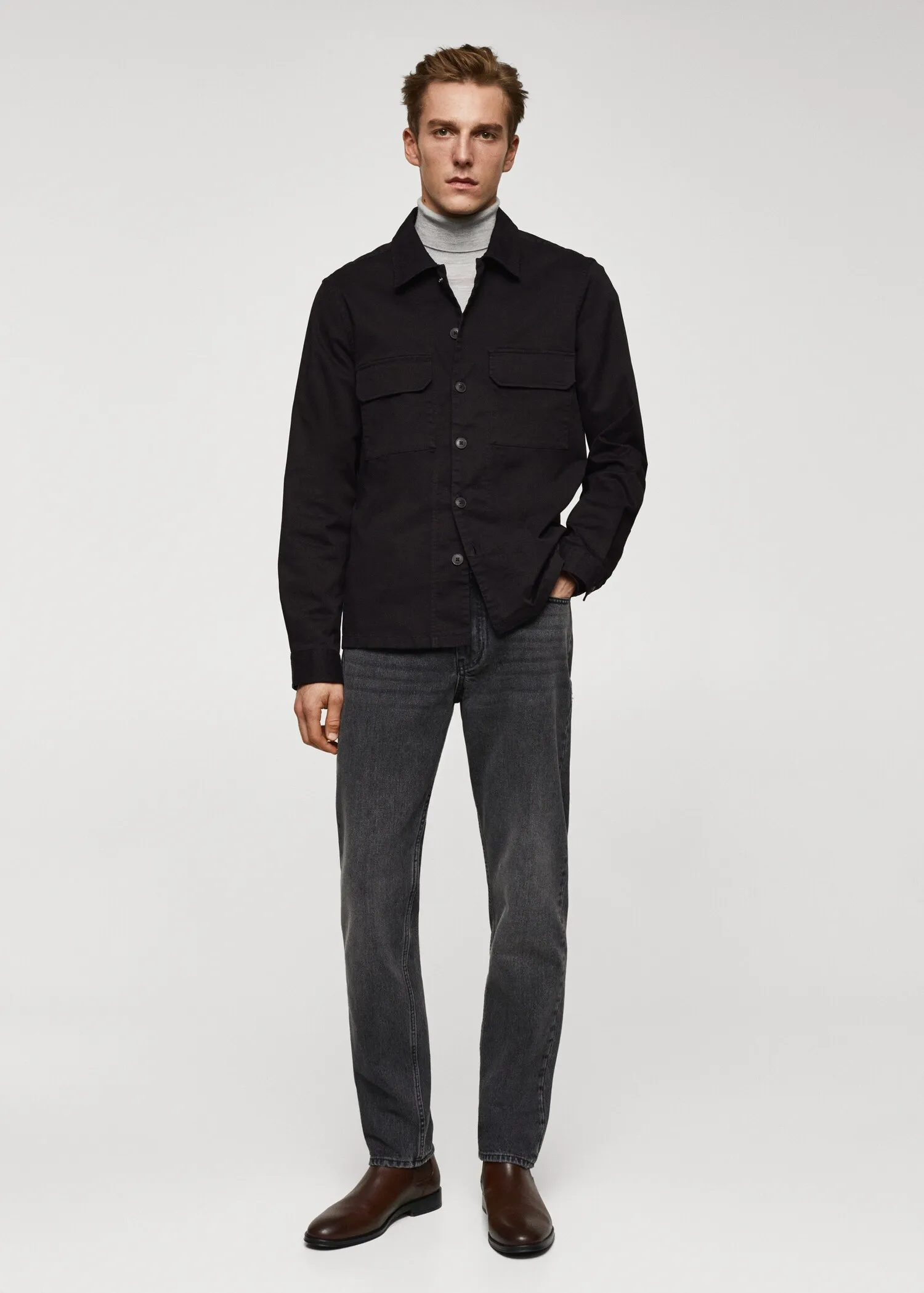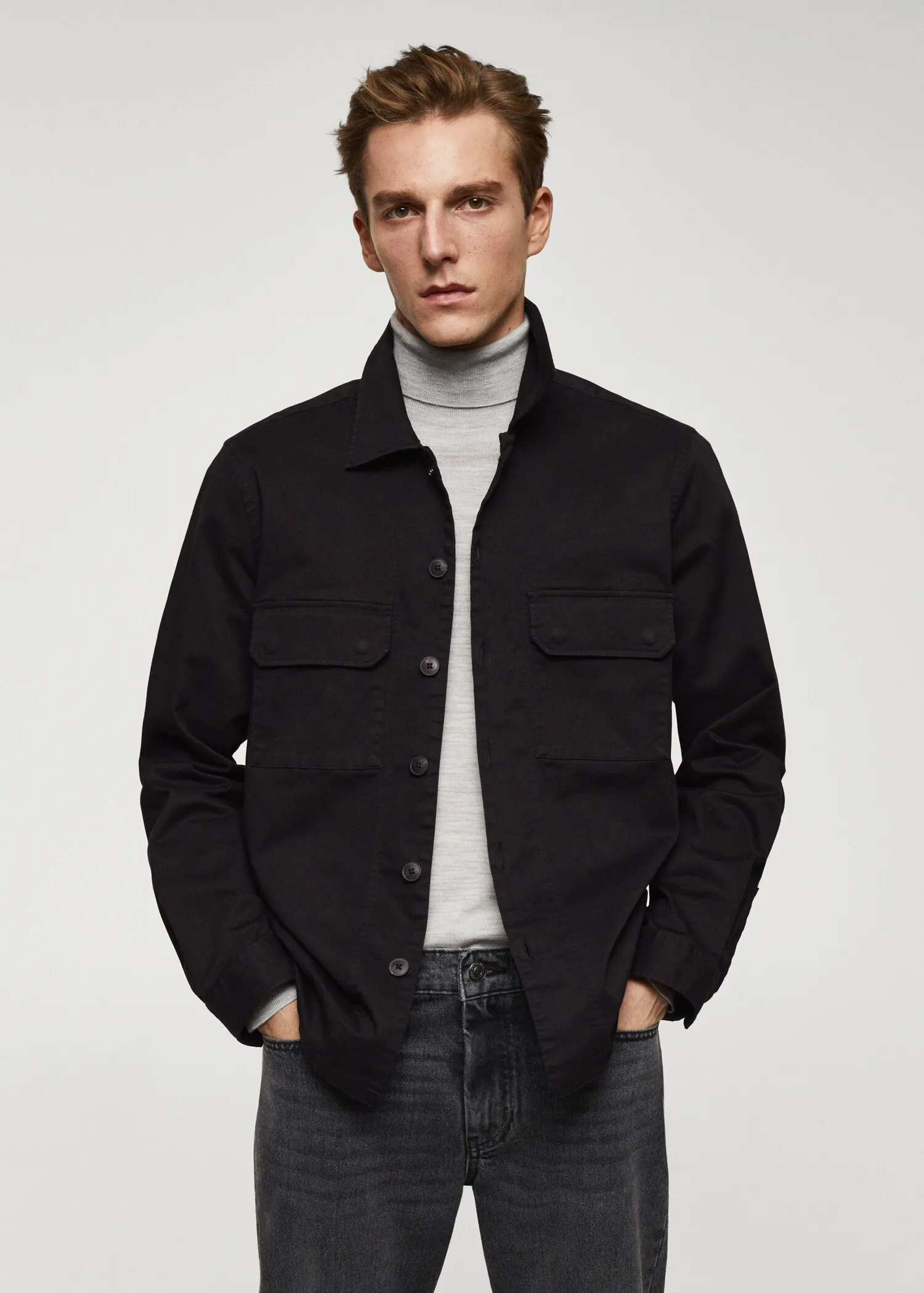 Regular fit. Stretch cotton fabric. Two patch pockets with flaps on the chest. Long sleeve with buttoned cuffs. Straight hem. The model is 6’3″ and is wearing a size M. Classic collar. Front closure with buttons.